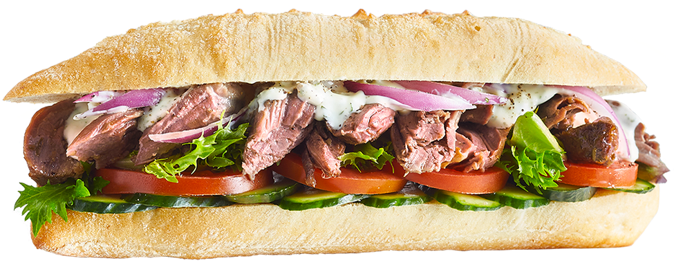 Slow Roasted Lamb Marinated in Sweet Paprika, Oregano and Rosemary + Cucumber + Tomato + Lettuce + Spanish Onion + Fresh Mint + Tzatziki Sauce on our Freshly Baked Pain de Campagne Roll