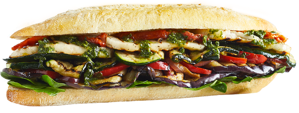 Char-Grilled Eggplant and Zucchini, Sautéed Capsicums and Onion + Baby Spinach + Semi-Dried Tomato + Grilled Halloumi + Pesto Dressing on our Freshly Baked Pain de Campagne Roll