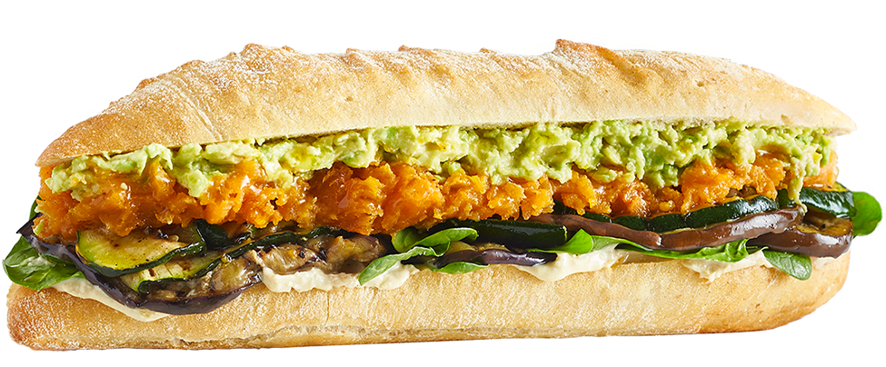 Smokey Sweet Potato + Char-Grilled Eggplant and Zucchini + Smashed Avocado + Baby Spinach + Hummus + Chilli Oil on our Freshly Baked Pain de Campagne Roll